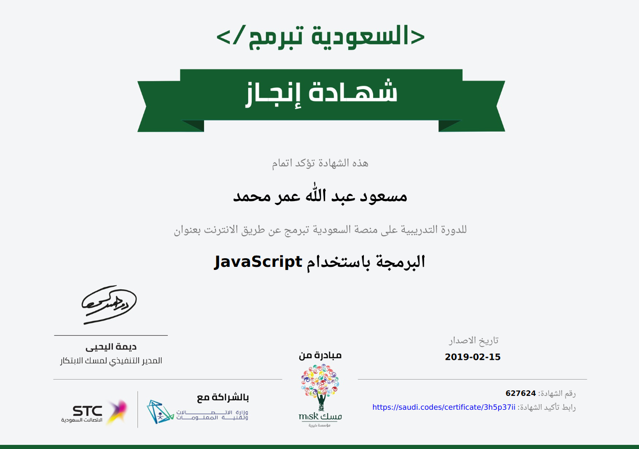 شهادة في تعلم أساسيات البرمجمة لغة JavaScript حيث يشرح الأساسيات والمبادئ العامة للبرمجة