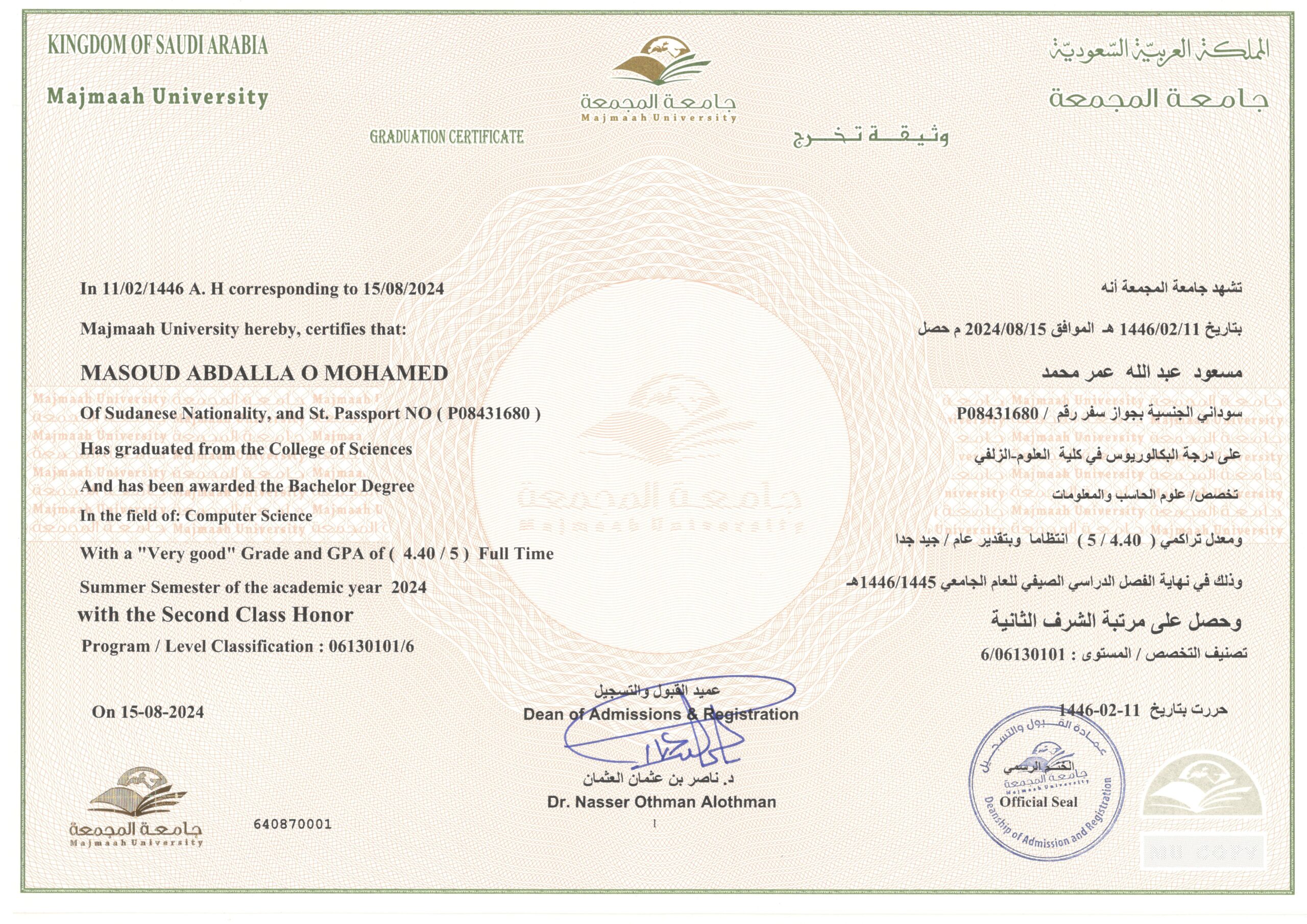 شهادة البكلاريوس الحاصل عليها من جامعة المجمعة في تخصص علوم الحاسب، والتي كانت في عام 2024م