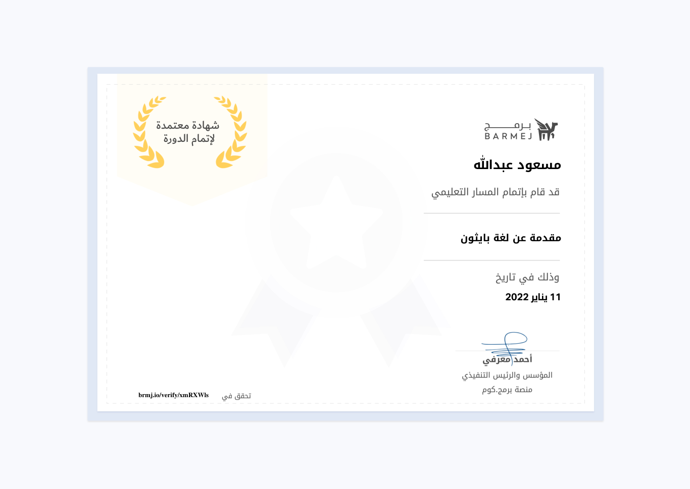 شهادة في جميع محتويات لغة البايثون وهي: أدواتها، الأنواع المختلفة من البيانات، المتغيرات التي يتم حفظ البيانات فيها، النصوص، هياكل البيانات التي تتكون من القوائم lists وتبلز والمجموعات، العمليات الحسابية و العلاقات الشرطية، الجمل الشرطية وجمل الدوران، والدوال